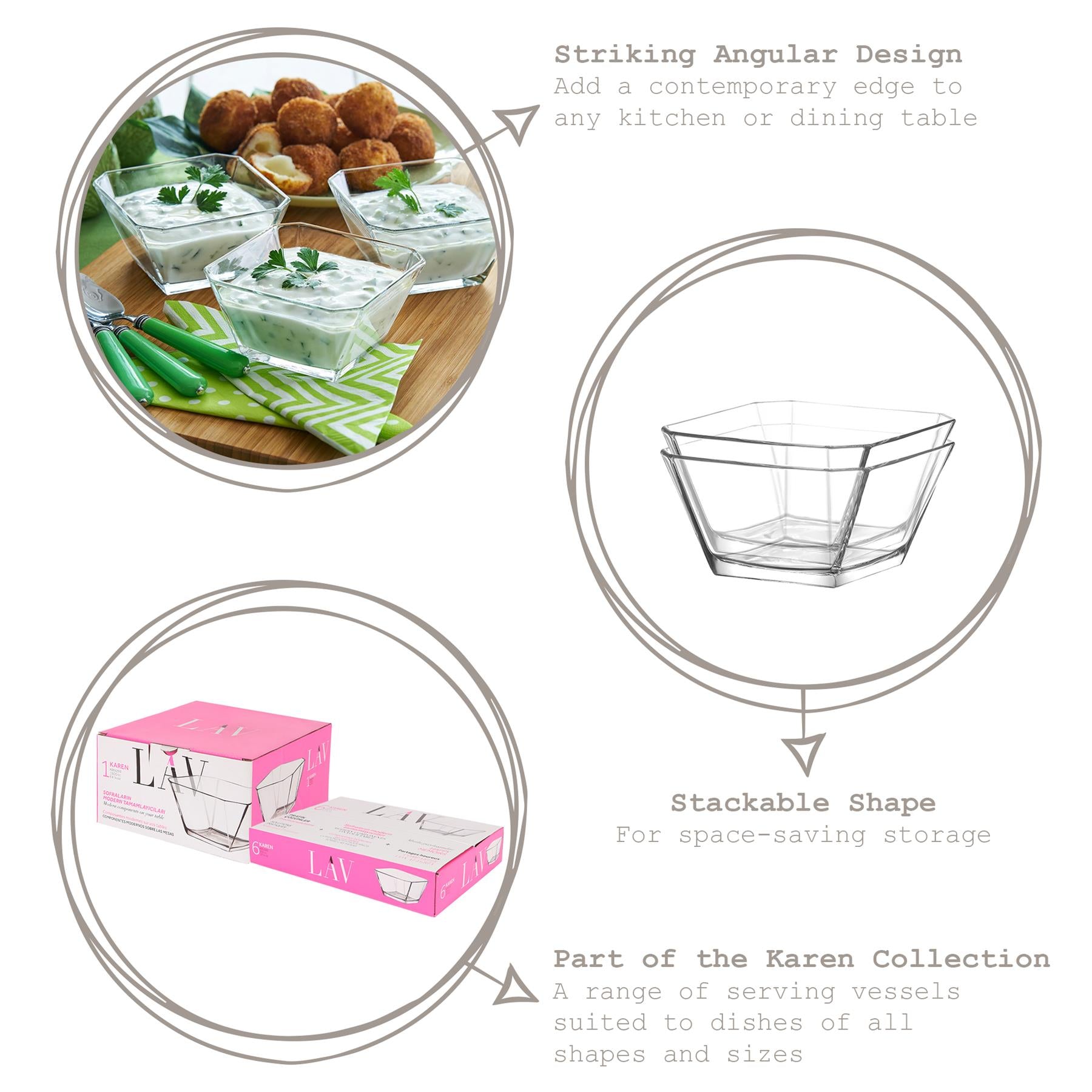 Whether shopping for business or pleasure, when it comes to products that effortlessly straddle the gap between fashion and function, the Karen collection of Glass Serving Bowls is sure to fill your home with LAV.
